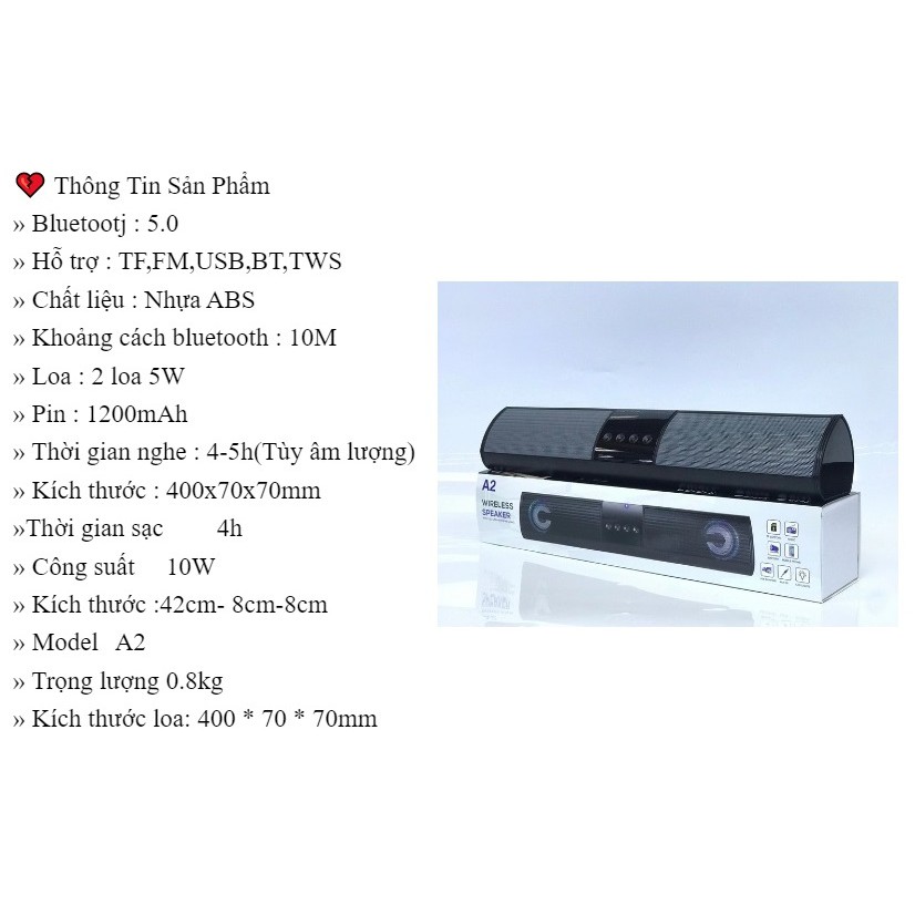 Thiết Bị Âm Thanh > Dàn âm thanh > Loa || Loa Bluetooth A2 Để Bàn Wireless Speaker Soundbar Dáng Dài Có Đèn Led, Âm Thanh Hay, Bass Khỏe, Có Chân Cắm Jack 3.5mmCòn hàng