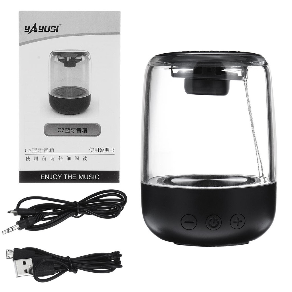 Loa bluetooth C7 đèn Led âm thanh vòm 6D - Loa bluetooth trong suốt yayushi siêu bassLoa bluetooth không dây có đèn led C7 trong suốt tích hợp đèn Led nhiều màu sáng theo nhịp nhạc, mang tới cho bạn một không gian sống sinh động và mới mẻ. Loa bluetooth C7 , không thể thiếu trong mỗi cuộc vui, âm thanh vòm 6D cực sống động. Kiểu dáng gọn nhẹ với thiết kế đẹp mắt và trẻ trung