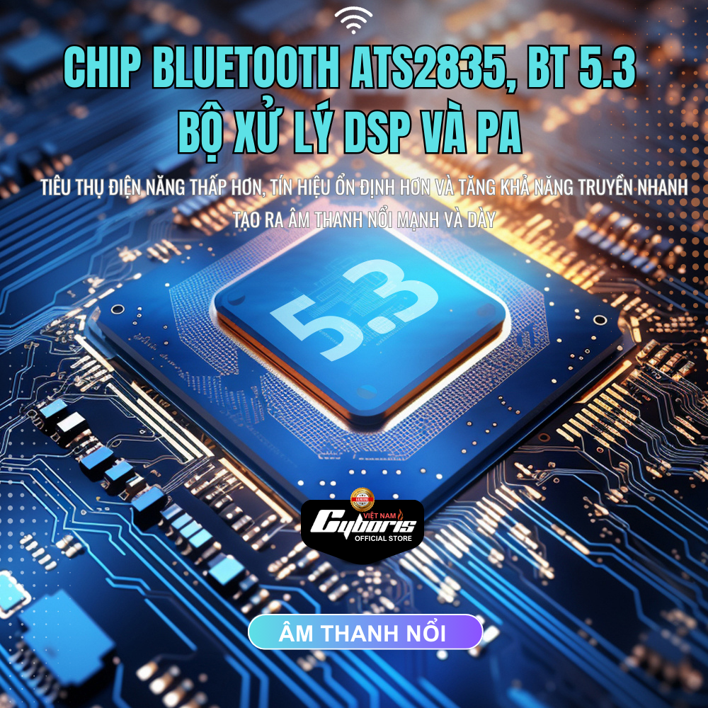 * Bluetooth 5.3 hỗ trợ BT và AuxTWS: Khoảng cách kết nối ≥18m, tiết kiệm năng lượng và có thể kết nối 02 Cyboris X9 với nhau để tạo ra âm thanh nổi không dây