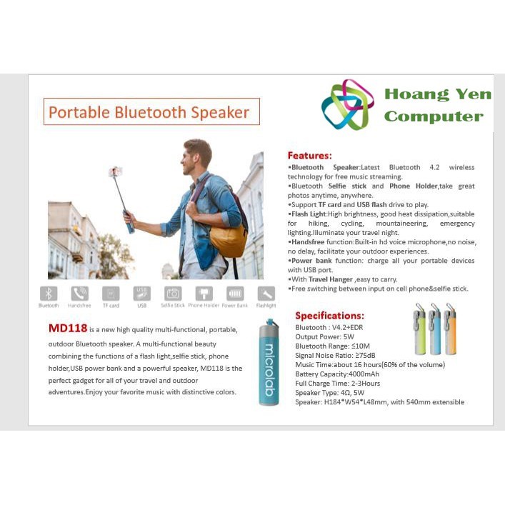 Loa Bluetooth Đa Năng Microlab MD118 Kiêm Gậy Tự Sướng, Đèn Pin, Pin Dự Phòng - BH 12 Tháng Chính HãngBảo hành 1 năm bằng tem tại shop. 1 đổi 1 trong 2 tuần đầu nếu lỗi kĩ thuật và sản phẩm còn mới không trầy, xước (Quý khách vui lòng giữ lại hộp và phụ kiện). Hổ trợ phí ship 2 chiều trong 15 ngày đầu nếu sản phẩm lỗi. Sản phẩm cần mở hộp để dán tem bảo hành.