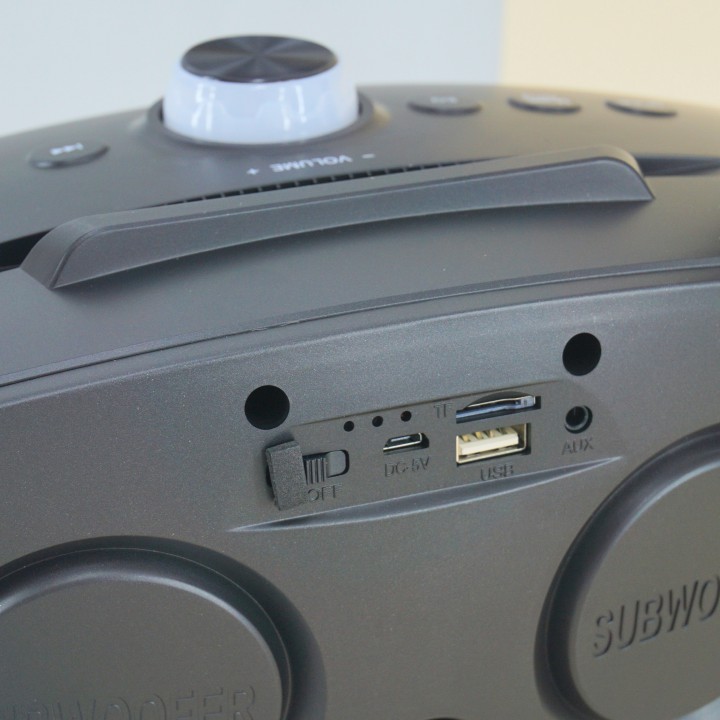 - Phía sau thân loa là các nút tắt bật nguồn, cổng sạc pin, cổng kết nối USB, khe cắm thẻ nhớ và cổng 3.5 để lấy âm thanh từ tivi hay điện thoại...
