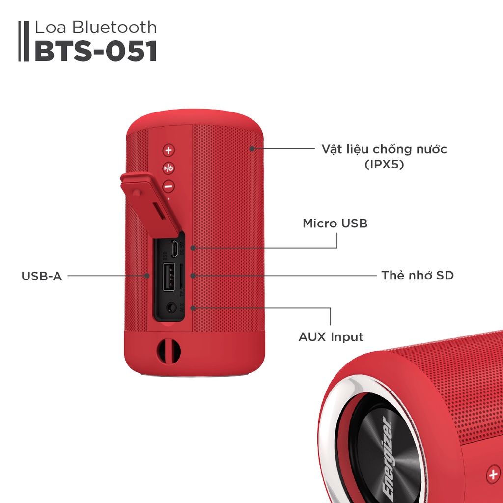 Loa Bluetooth Kèm Pin Sạc Dự Phòng Energizer BTS-051, Dung Lượng 2,000mAh, Chống Nước Theo Tiêu Chuẩn IPX5, Hỗ Trợ Thẻ Micro SD, AUX