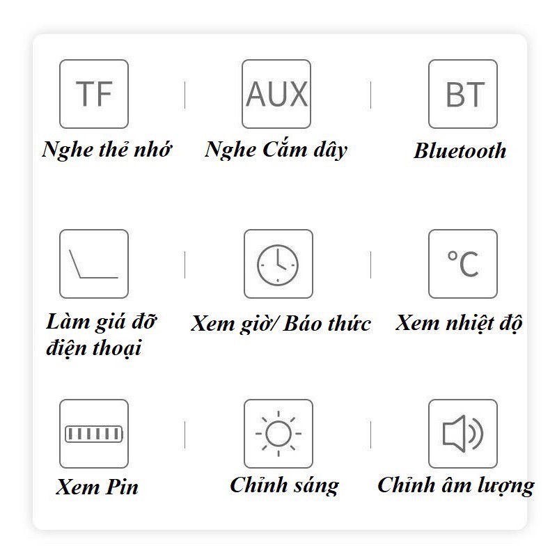 + Dung lượng pin cao, đa chức năng ( Nghe nhạc - Đồng hồ báo thức - Đài FM - Gương - Đồng hồ - Đồ trang trí )
