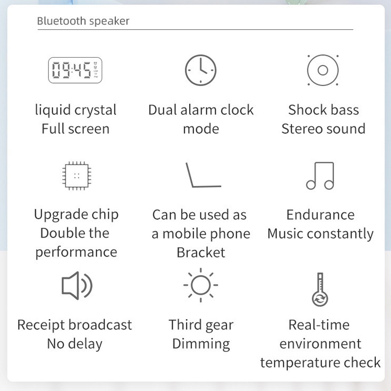 🔥 Tính năng nổi bật:+ Âm thanh từ loa to rõ, chắc âm, bass lớn. Khi sở hữu sản phẩm này vừa có một chiếc loa nhỏ gọn, một chiếc đồng hồ hiển thị thời gian, nhiệt độ và cả một chiếc gương để trang điểm.