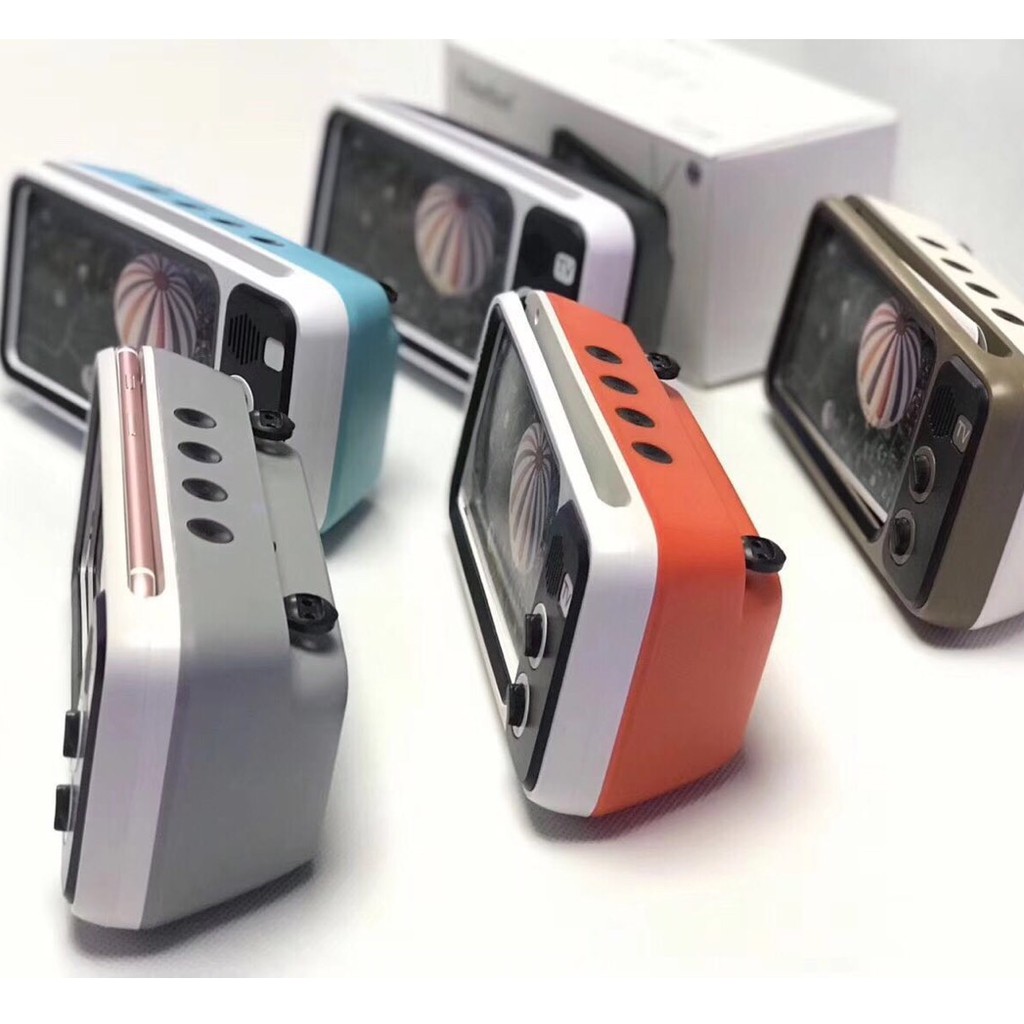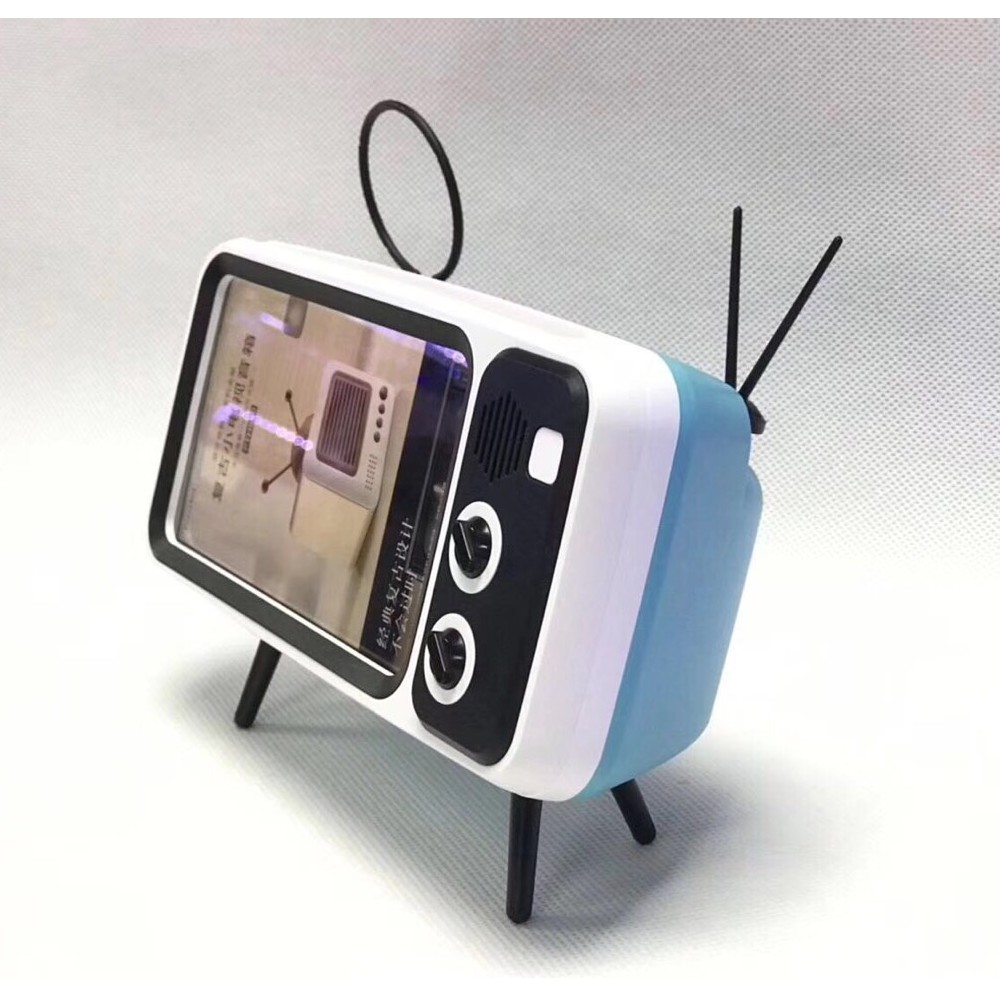 Thiết kế "vui vẻ" của nó với hình dáng của 1 chiếc ti vi cổ. Chỉ cần nhét điện thoại vào khoảng trống trên loa, bạn sẽ có 1 chiếc Ti vi cổ với màn hình cảm ứng. Ngoài kết nối bluetooth, anh em cũng có thể kết nối qua cổng USB, dùng thẻ nhớ hoặc mở đài FM.