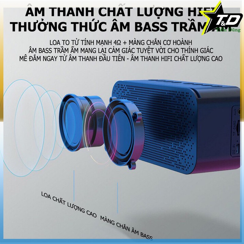 - Phát nhạc được từ: Thẻ nhớ, Bluetooth, dây cáp AUX.