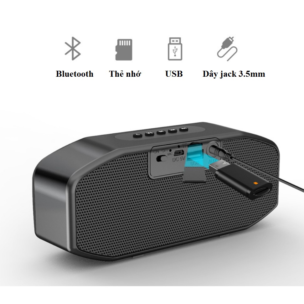 - Loa MaNoVo M4 còn có thể sử dụng kết nối bằng dây jack 3.5mm thông qua cổng 3.5mm và còn được hỗ trợ khe gắn thẻ nhớ và cổng USB giúp các bạn nghe nhạc mà không cần phải kết nối với điện thoại.