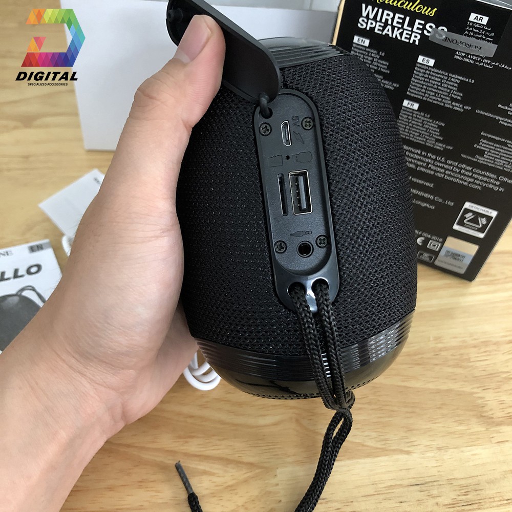 - Loa còn được trang bị đèn LED để thông báo trạng thái hoạt động đến người dùng. Bạn chỉ cần nhấn giữ trong 1s nút ON trên cạnh loa là đèn LED sẽ tự động phát sáng. Để tắt loa bạn cũng dùng thao tác tương tự. Cạnh bên nút ON/ OFF của loa còn có một nút tăng/ giảm âm lượng cũng như chuyển bài và một nút dừng nhạc, chuyển sang chế độ rảnh tay. Loa được thiết kế với chip thông minh và màng lọc âm giúp âm thanh phát ra được êm tai, không bị nhiễm tạp âm. Do đó đem lại trải nghiệm âm nhạc cho bạn tốt hơn. Như vậy chỉ với thao tác bật kết nối Bluetooth với loa là bạn đã có thể thưởng thức những bản nhạc ưa thích của mình rồi.