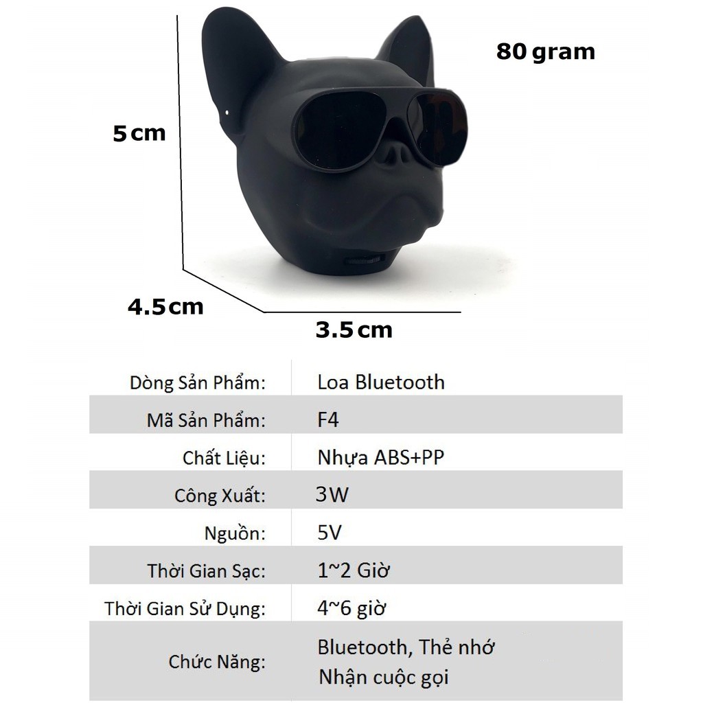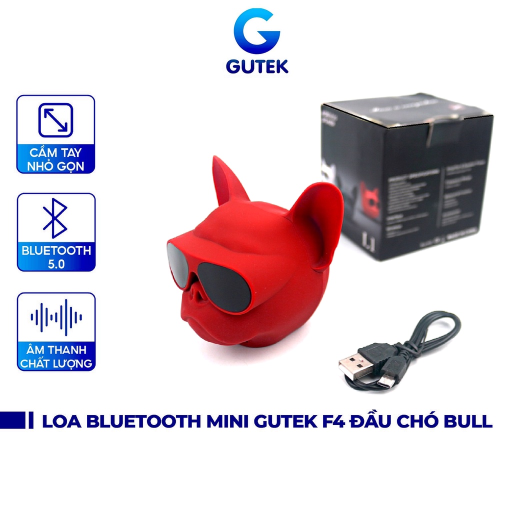 - Loa bluetooth mini đầu chó Bull Gutek F4 là dòng loa có vẻ ngoài cực kì đẹp, tạo hình đầu chú chó bull cực ngầu, nhỏ bằng lòng bàn tay của bạn với công suất loa 5w nhưng âm thanh mang đến lại hay không kém những dòng loa cỡ lớn đắt tiền.