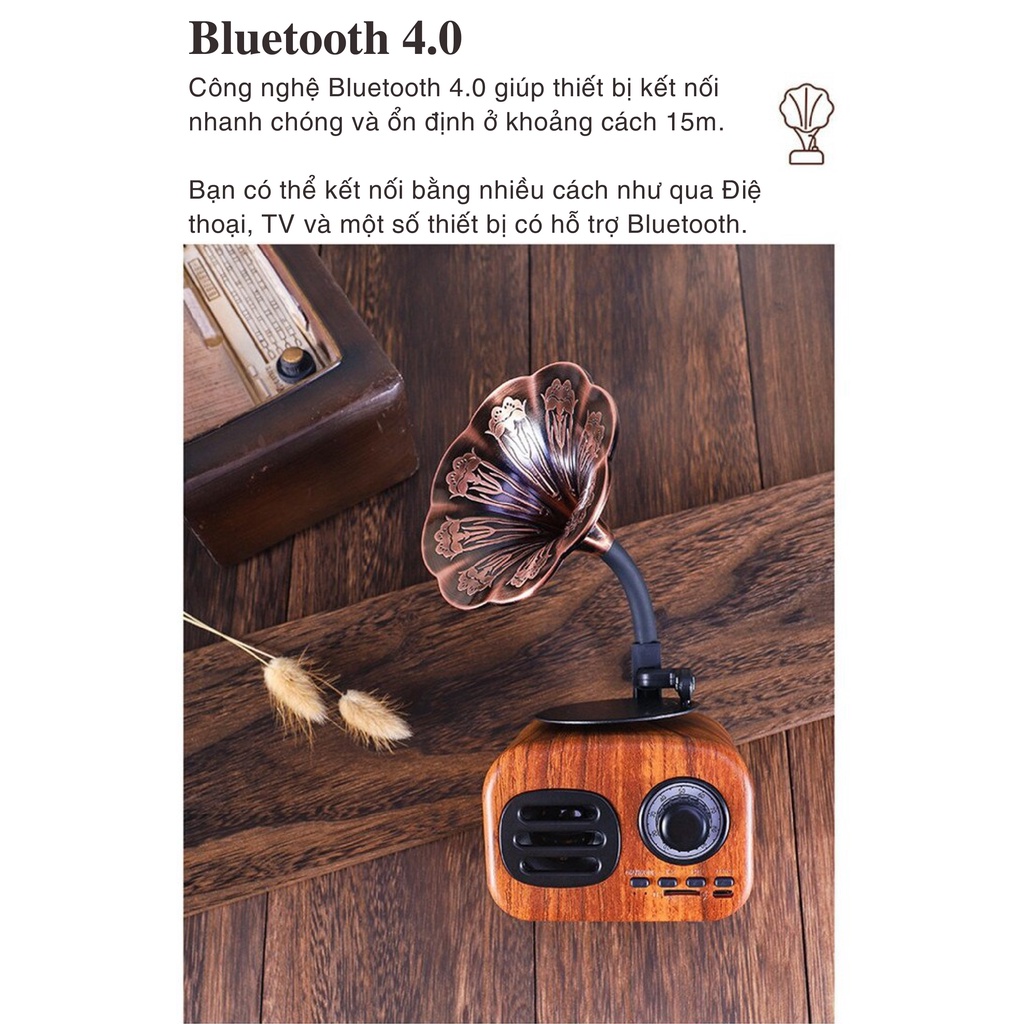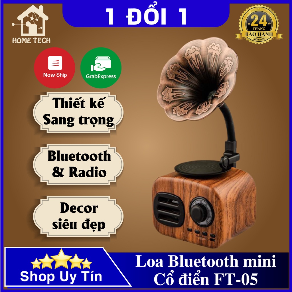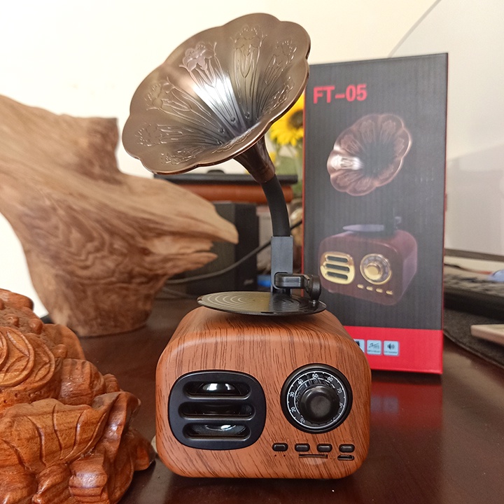 Loa Bluetooth phong cách cổ điển classic style FT-05 âm thanh siêu trầm công suất 5WLoa Bluetooth FT-05 có thiết kế độc lạ hình hoa loa kèn màu vân gỗ, style cổ điển. Loa có công suất 5W nên âm thanh trầm ấm, giúp bạn có một không gian lắng trong âm nhạc.