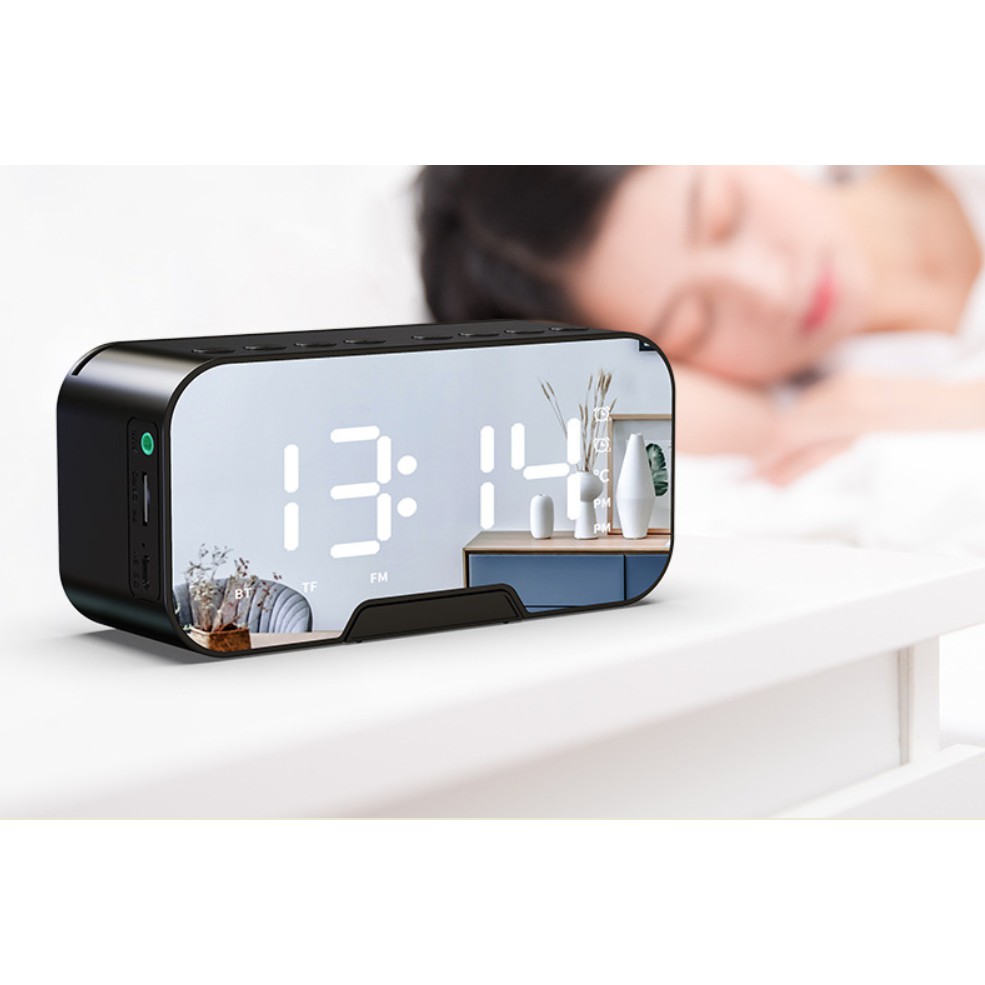 Đồng hồ báo thức kết hợp loa bluetooth dạng gương có mặt kính được tráng gương trong suốt, có thể ngắm nhìn gương mặt xinh đẹp của bạn- Có thể sử dụng kết nối loa bluetooth, thẻ nhớ, và cắm trực tiếp vào loa.