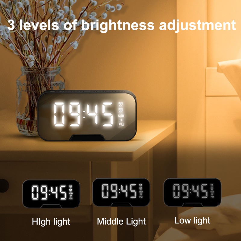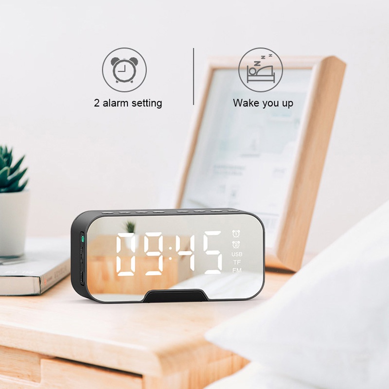 Đồng hồ báo thức kết hợp loa bluetooth dạng gương có mặt kính được tráng gương trong suốt, có thể ngắm nhìn gương mặt xinh đẹp của bạn- Có thể sử dụng kết nối loa bluetooth, thẻ nhớ, và cắm trực tiếp vào loa.