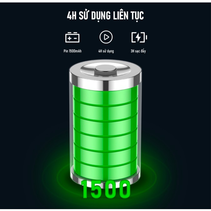- Dung lượng pin 1.500 mAh, thời gian sử dụng lên đến 4h, thời gian sạc pin 3h.