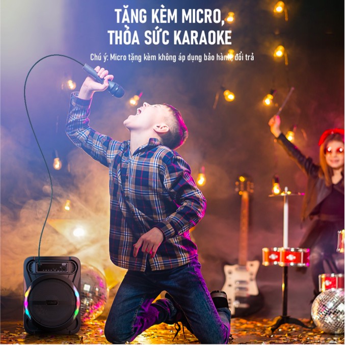- Loa đi kèm Micro Karaoke, hỗ trợ loại bỏ tiếng ca sĩ trong bài hát, tận hưởng các bài hát karaoke sôi động.