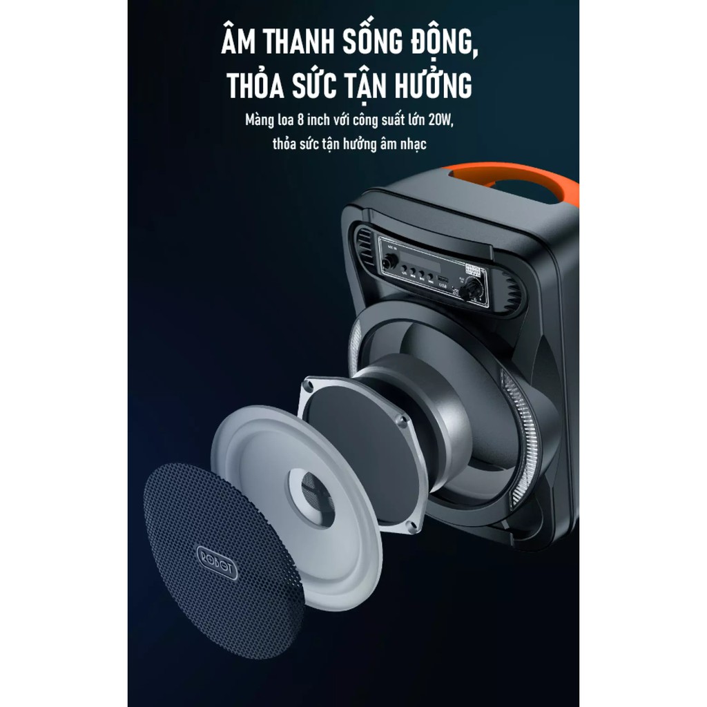 LOA BLUETOOTH ROBOT RB450 NGOÀI TRỜI - HIỆU ỨNG ĐÈN LED RGB - KÈM MICRO KARAOKE, ĐIỀU KHIỂN HỒNG NGOẠI - CÔNG SUẤT 20W - BẢO HÀNH 12 THÁNG.Sản phẩm chính hãng ROBOT