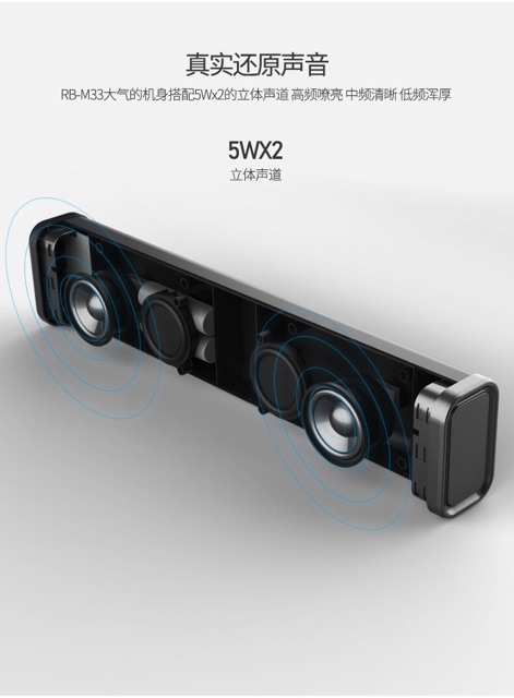 - Âm thanh trong trẻo, tuyệt vời ấy không chỉ được phát qua công nghệ Bluetooth hiện đại 5.0 mà bạn còn có nhiều phương án lựa chọn thuận tiện hơn cho bản thân. Trên loa RB-M33 còn được bổ sung thêm cổng thẻ TF, cổng âm thanh AUX và cổng USB. Với cổng AUX 3.5mm bạn có thể kết nối điện thoại hay máy nghe nhạc,... với loa mà không cần mở Bluetooth. Đây là tính năng thuận tiện với những thiết bị không có Bluetooth