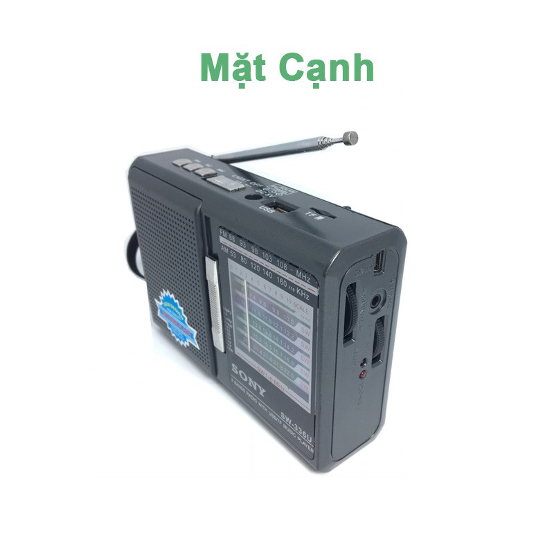 - Đài SW 336U với thiết kế màu đen pha chút màu trắng làm điểm ngấn,chất liệu làm bằng nhựa cao cấp , hình chứ nhật với thiết kế bên trái là loa bên phải là bảng chỉnh tần số FM, AM, SW, và MP, mặt trên thì có các nút chỉnh các cổng đọc USB, thẻ nhớ, cổng cắm sạc . Hai cạnh còn lại là cắm sạc, đèn pin , chỉnh âm lượng , chỉnh tần số đâì . Mặt sau được thiết kế để dùng 2 loại pin là Pin 5C và Pin con thỏ loại lớn.