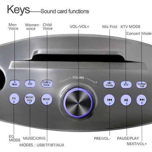 • Loa có hỗ trợ chức năng card âm thanh tích hợp không dây thay đổi giọng nói miễn phí, giọng nam, giọng nữ, giọng bé..
