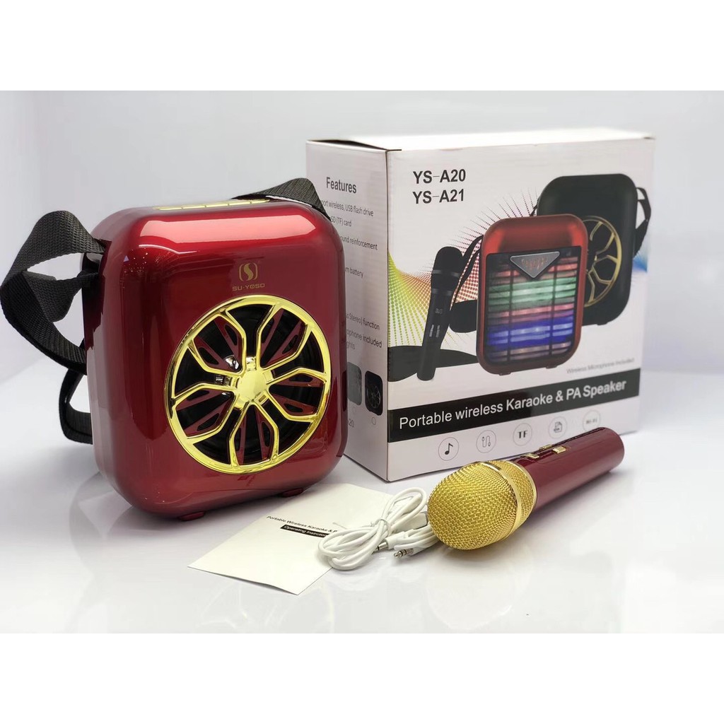 Bộ mic và loa hát karaoke di động YS20 kết nối bluetooth từ điện thoại, máy tính, ipad .... mang lại trải nghiệm tuyệt vời tại nhà với giá chỉ bằng 1 giờ đi hátSử dụng máy: Đeo ngang hông bằng dây đai, hoặc đeo chéo qua người bằng dây đeo rimax- Sử dụng mic: Mic gài đầu (kiểu MC) hoặc mic mini cầm tay có dây- Hỗ trợ kết nối đa phương tiện Mp3 với thiết bị ngoài: Mobile, Laptop, Tab, thiết bị số...- Phù hợp lớp học hay phòng 50 - 60 người- Âm thanh vang, rõ, lớn.- Loa trợ giảng được sử dụng cho: Giáo viên giảng bài, thuyết trình, hướng dẫn viên du lịch, các hoạt động cần khuếch đại âm thanh ngoài trời, người dẫn trong các sự kiện, hội chợ, bán hàng lưu động, các hoạt động trong phòng tập...