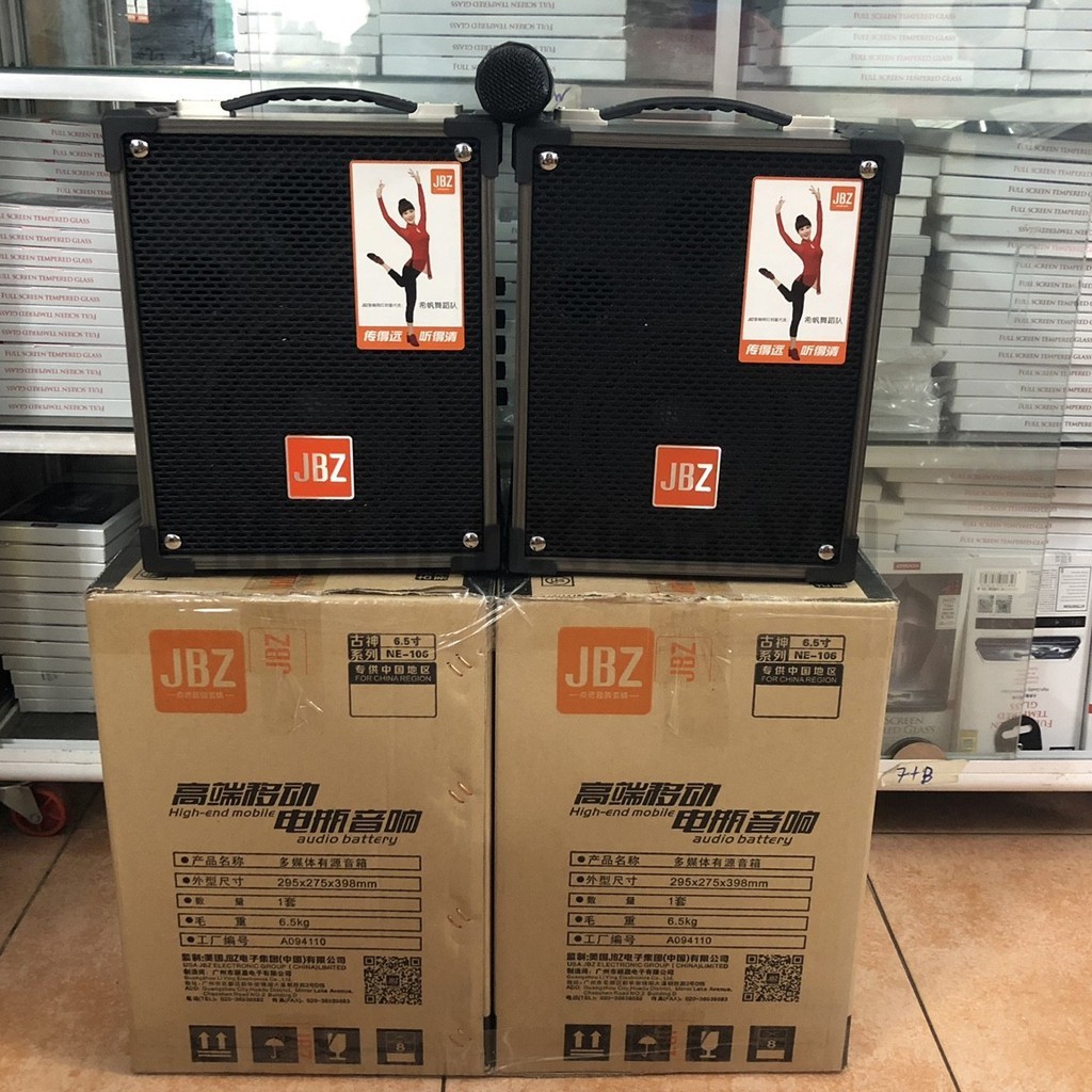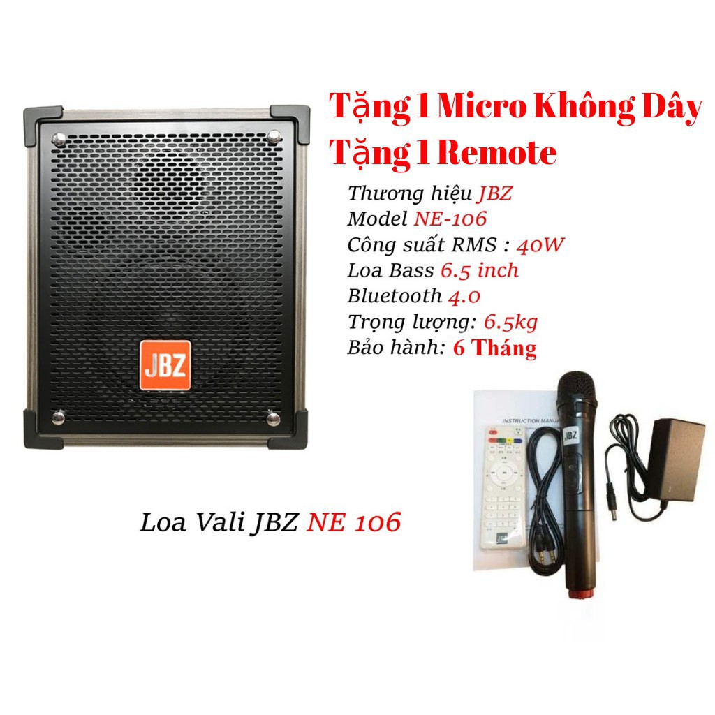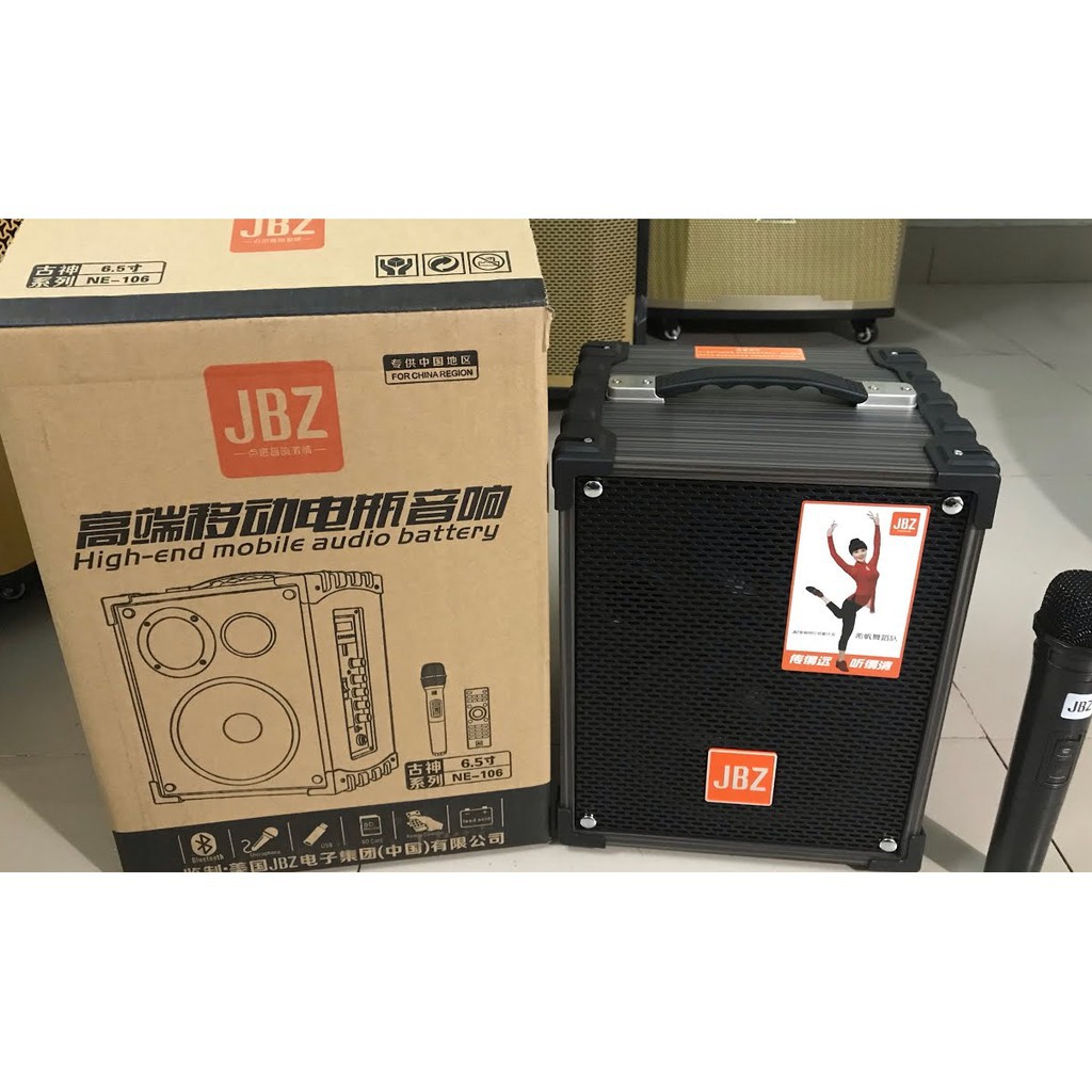Loa kéo di động JBZ - NE106, mẫu nhỏ nhất trong 4 model 106/107/108/109, với vỏ loa đóng bằng gỗ được bọc bên ngoài một lớp simili để tăng tính thẩm mỹ bên ngoài và làm tăng giá trị của sản phẩm. Loa sử dụng củ loa 6.5 inch nên công suất phát khá tốt so với nhũng dòng loa khác trên thị trường