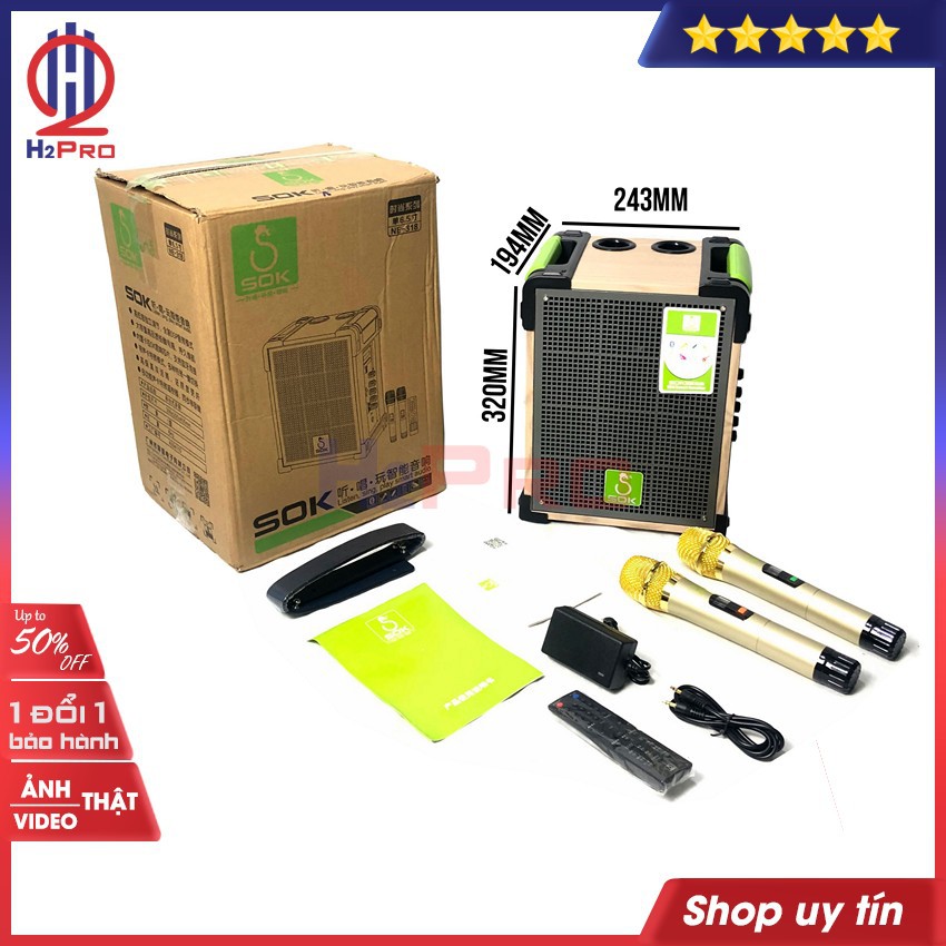 - Loa SOK 318 là mẫu loa mới nhất hiện nay với nhiều nét mới, vỏ thùng với tông màu vàng vân gỗ cự đẹp sang trọng, 2 bên cạnh loa được trang bị 2 tay năm xách rất tiện lợi, trên mặt loa có 2 lổ cắm mic tiện lơi, mặt lưới kim loại dày chắc chắn cùng thiết kế lổ lưới đẹp mắt cùng với cặp mic vỏ màu vàng đầu ốp và tay pin bằng kim loại chắc chắn và sang trọng, đảm bảo là sản phẩm hứa hẹn mang lại được tính năng nhỏ gọn dễ dàng di chuyển nhưng âm thanh rất hay, mic hát cự nhẹ.