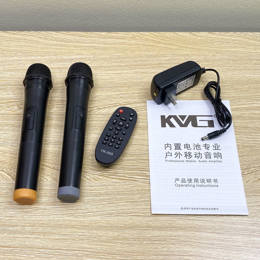 Bộ sản phẩm bao gồm: Loa kéo KVG LA-012, 2 mic không dây, điều khiển từ xa, sách hướng dẫn và adater sạc.