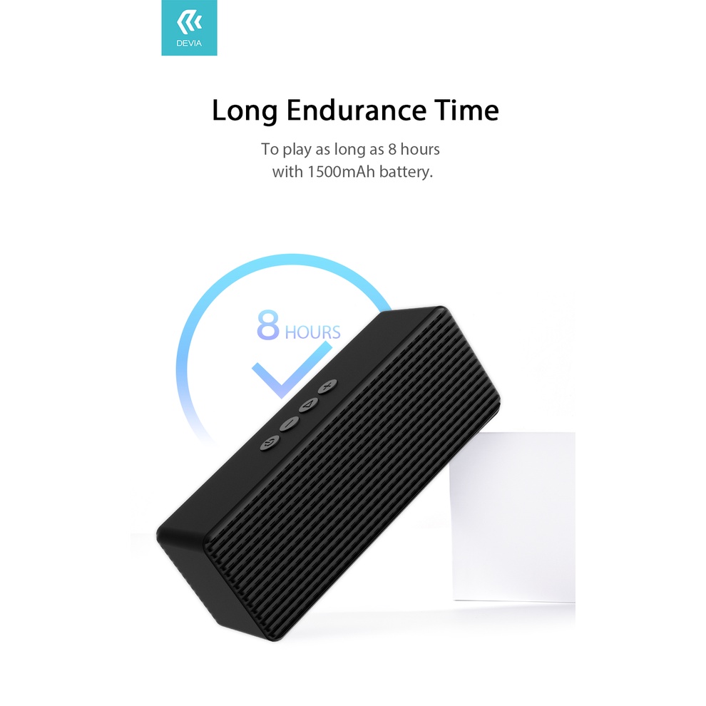 - Loa không dây bluetooth DEVIA có dung lượng pin lớn thời gian bền lâu,có thể nghe nhạc, thực hiện cuộc gọi liên tục trong 8h
