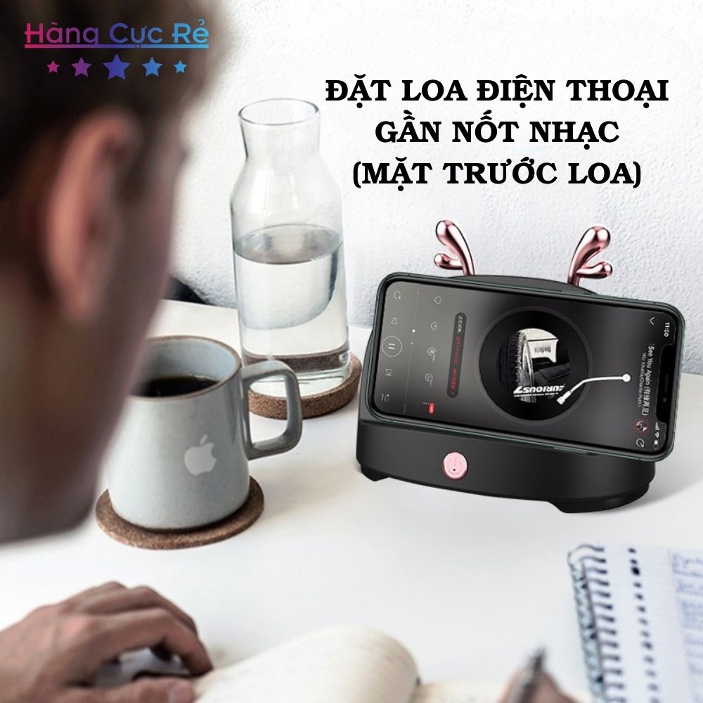 - Chỉ cần nhấn nút On/Off, đặt điện thoại lên loa, vị trí có hình Nốt nhạc.