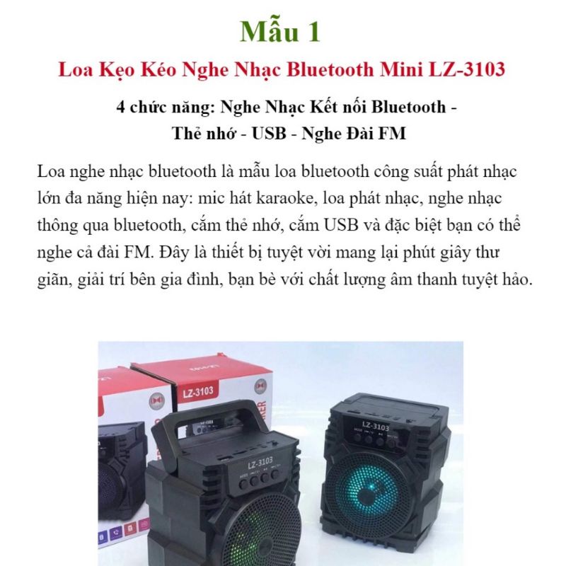 Loa nghe nhạc bluetooth Lz-3103 Loa bluetooth min đèn LED nhấp nháy âm thanh siêu hay hỗ trợ cắm thẻ nhớ- Loa nghe nhạc bluetooth Lz-3103 trang bị công nghệ bluetooth vô cùng phổ biến nên bạn có thể kết nối loa với các thiết bị công nghệ thông minh như điện thoại, máy tính bảng, laptop đấy nhé. Sử dụng bluetooth ở loa cũng rất đơn giản, chỉ cần mở nguồn là loa sẽ tự động mở kết nối , sau đó kết nối của điện thoại bạn với loa là có thể nghe nhạc, xem phim, gọi điện trò chuyện thông qua loa cực kì thoải mái thoải mái.