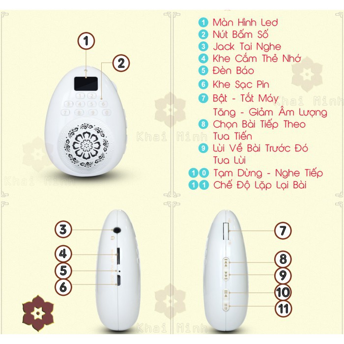 - Có phím chức năng chuyển đổi từ chế độ nghe bài niệm cài sãn trong máy hoặc nghe bài giảng theo thẻ nhớ.