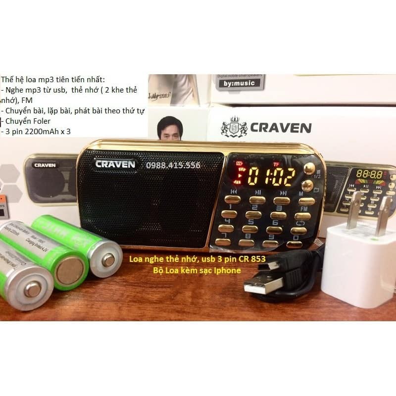 Thiết Bị Âm Thanh > Máy nghe nhạc > Radio & Cát-sét || Loa nghe thẻ nhớ, Usb, FM 3 pin Craven CR 853Còn hàng