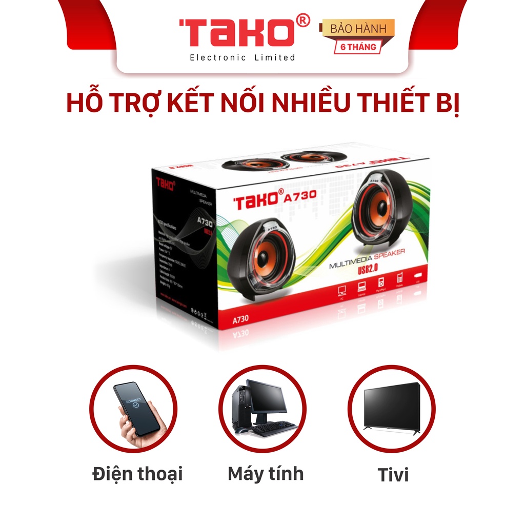 - Loa 2.0 TAKO A730 có thiết kế trẻ trung mang, nhỏ gọn mang đến một phong cách âm nhạc hoàn toàn mới cho giới trẻ năng động và sáng tạo. Loa 2.0 TAKO A730 ấn tượng với kiểu dáng bắt mắt