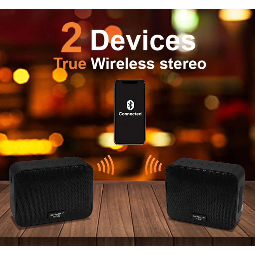 SoundMax R-300 là dòng loa bluetooth nhỏ gọn, hỗ trợ kết nối bluetooth chuẩn 5.0, thẻ nhớ TF lên đến 128GB và kết nối AUXNgoài ra bạn có thể kết nối 2 mẫu R-300 với nhau để tạo thành 1 bộ loa 2.0 thông qua kết nối không dây True Wireless.