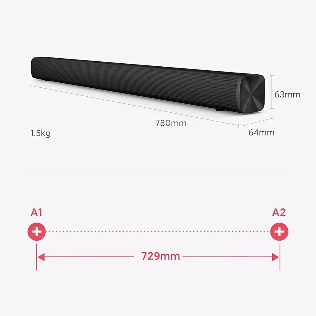 + Loa soundbar TV Redmi sở hữu kích thước vừa phải 780 x 64 x 63mm và trọng lượng 1.5kg cho phép người dùng bố trí ở nhiều không gian khác nhau. Bên cạnh đó, sản phẩm với màu sắc tối giản cùng thiết kế thanh lịch, các góc cạnh được bo tròn mềm mại, đẹp mắt mang đến vẻ ngoài sang trọng, tinh tế.