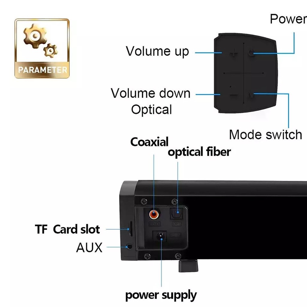 + Kết nối :bluetooth,USB, 3.5,AUX, thẻ nhớ, cáp quang , Kích thước :80*6,4*5,1 cm