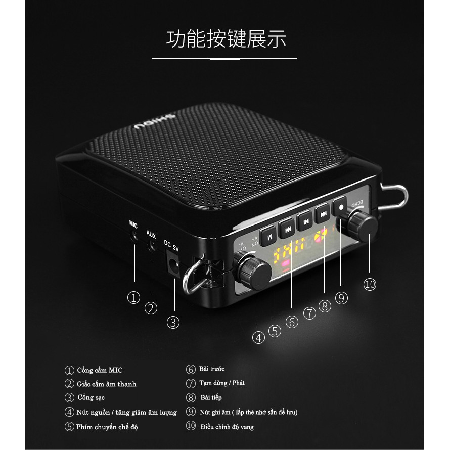 Công dụng : Kết nối Bluetooth,Trợ giảng,nghe nhạc qua thẻ nhớ , USB , ghi âm và phát lại .