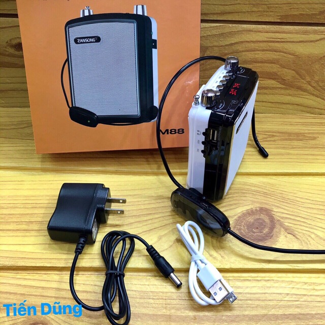- Máy trợ giảng Zansong M88, sản phẩm có chất lượng khá tốt với nhiều tiện ích: trợ giảng - nghe nhạc - nghe radio...Đặc biệt loa sử dụng kết nối wireless với micro không dây và phạm vi kết nối có thể lên đến gần 50 mét, loa còn có thể nghe nhạc qua kết nối bluetooth với các thiết bị như : điện thoại - laptop - máy tính bảng ...