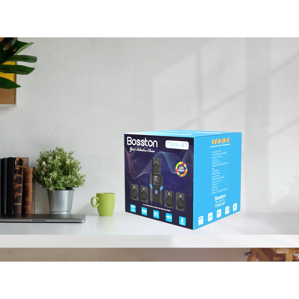 Loa nghe nhạc Bosston T3800-BT sở hữu dàn âm thanh sống động bao gồm 1 loa siêu trầm và 4 loa vệ tinh được trang bị hệ thống âm thanh 5.1 kênh giúp cho người dùng có thể trải nghiệm âm thanh trong game, phim ảnh hay ca nhạc trở nên sống động, đặc sắc hơn. 5 loa có thiết kế theo dạng khối vuông mạnh mẽ, được phủ một lớp sơn bóng loáng trên mặt loa siêu trầm thu hút người dùng.