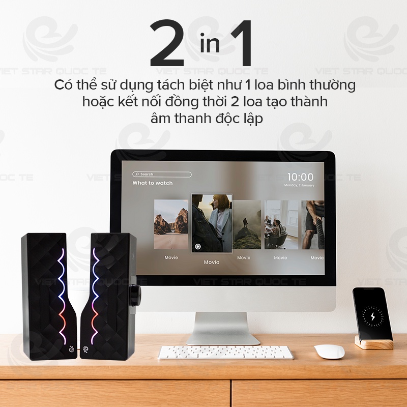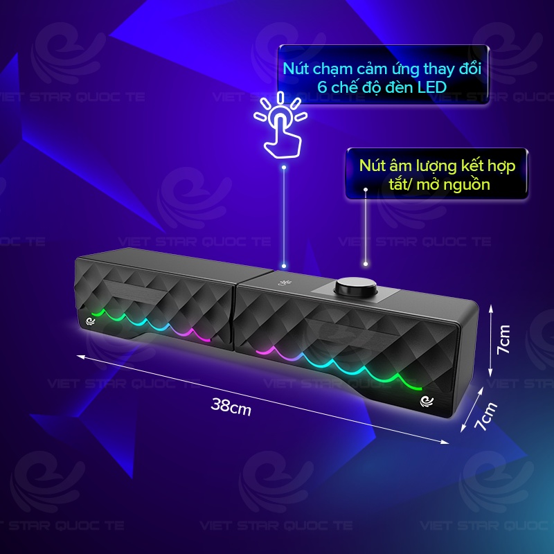 Loa máy tính- Loa Bluetooh để bàn VIET STAR VS168 - Nhựa cứng ABS-Hiệu ứng đèn LED 7 màu hình kim cương đổi màu liên tục- Hỗ trợ kết nối Bluetooh- Tháo rời 2 loa hoặc ráp thành 1 loa dài cực đẹp-Âm thanh 3D- Bảo hành 12 thángTHÔNG SỐ SẢN PHẨM