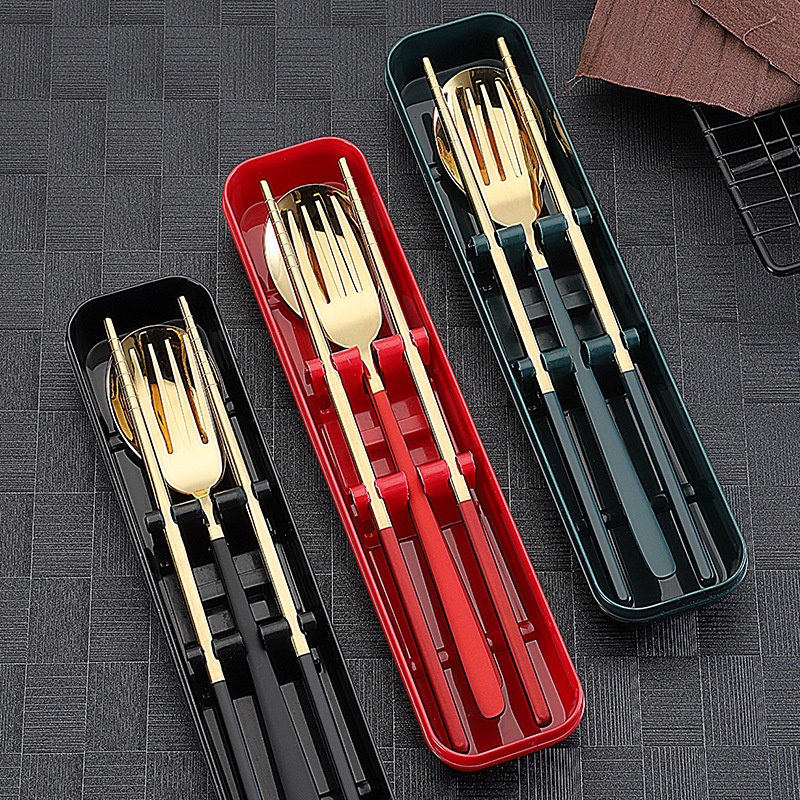 [LOẠI 1] Bộ 3 món muỗng đũa dĩa cao cấp Kamn inox 304 , mạ vàng, cán 3 màu, có hộp đựng tiện lợi