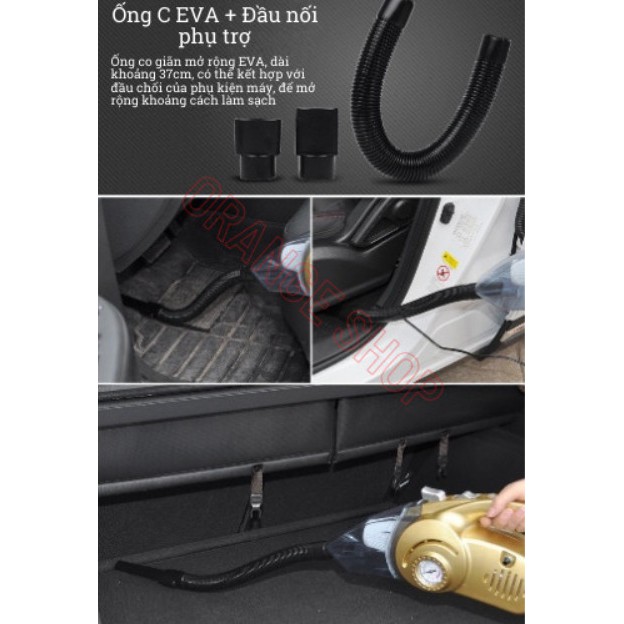 - Chức năng : Hút bụi + Bơm xe + Đo áp suất lốp + Đèn pin