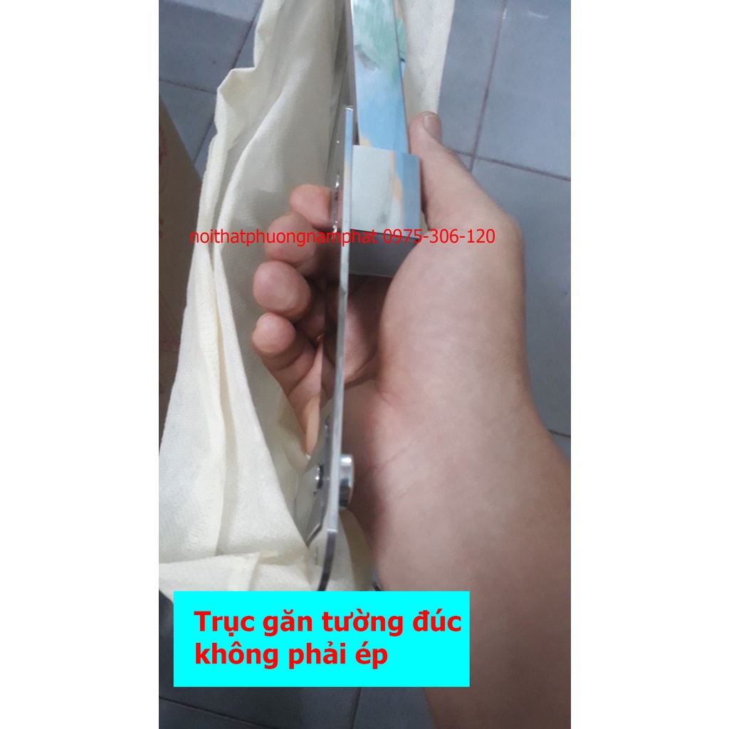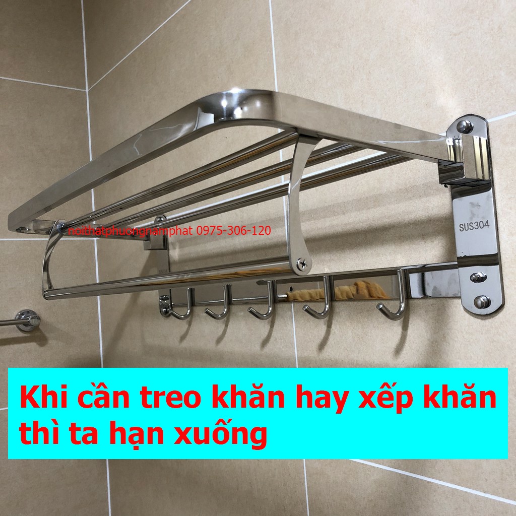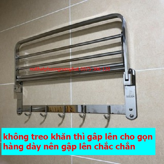 Máng khăn có thể gập lên gập xuống khi ta để khăn thì gập xuống vuông góc để treo khăn, hay xếp khăn lên kệ, khi ta không dùng nữa thì gập máng khăn thẳng lên sát tường cho gọn gàng