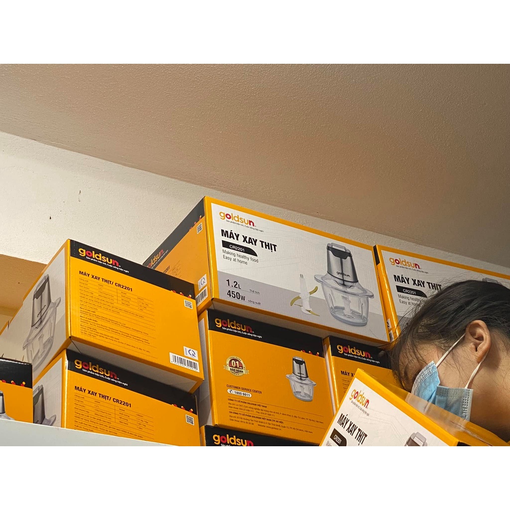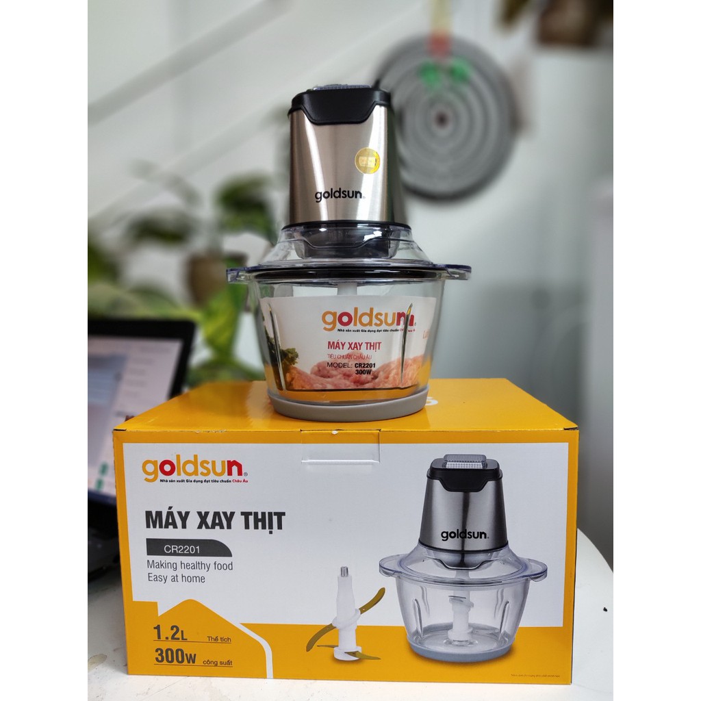 Giới thiệu (Loại450W)Máy xay thịt đa năng GOLDSUN CR2201, dung tích 1.2L, Cối thủy tinh, Lưỡi dao kép Inox 304, BH chính hãng 1 năm