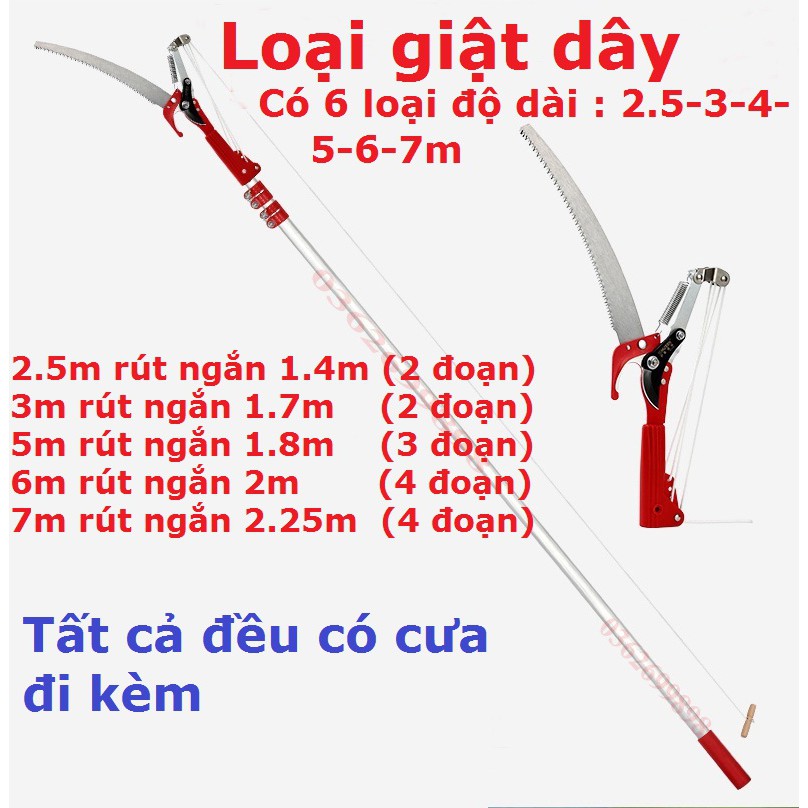 -Loại thứ 2 : Kéo hái quả,cưa cành trên cao giật dây kèm gậy chuyên dụng với độ dài 2.5-3-5-6-7-8-10m