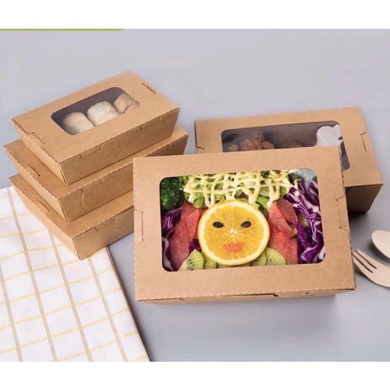 Lốc 10 hộp giấy kraft nắp gập cửa sổ, hộp salat, sushi
