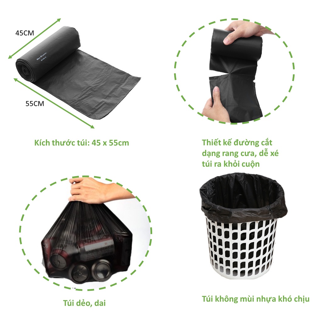 - Túi rác kích thước: 55 x65cm: phù hợp với nhiều cỡ thùng rác trung và nhỏ, thích hợp sử dụng cho gia đình 3 - 4 người.