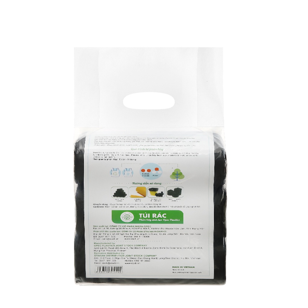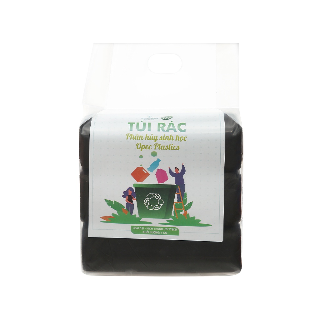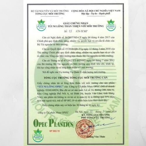 Lốc 3 Cuộn 1 Kg Túi Đựng Rác Sinh Học Tự Hủy Eco Green Opec Platics Cao CấpTúi rác tự phân hủy sinh học Green Eco Opec Plastics đạt giấy chứng nhận "Thân thiện môi trường" do Tổng cục Môi trường cấp. Dưới tác dụng của độ ẩm, các enzim và vi sinh vật trong đất được sản sinh ra trong quá trình phân hủy, Túi rác tự phân hủy sinh học Green Eco Opec Plastics sẽ bị phân hủy hoàn toàn thành CO2, H2O và các sinh khối có lợi cho môi trường.