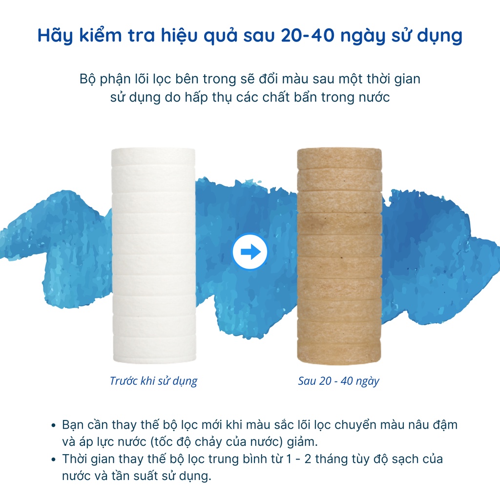 Thời lượng sử dụng : Khoảng 1-2 tháng ( Tùy theo nhiều yếu tố như độ sạch của nước, nhiệt độ, tần suất tắm,...)