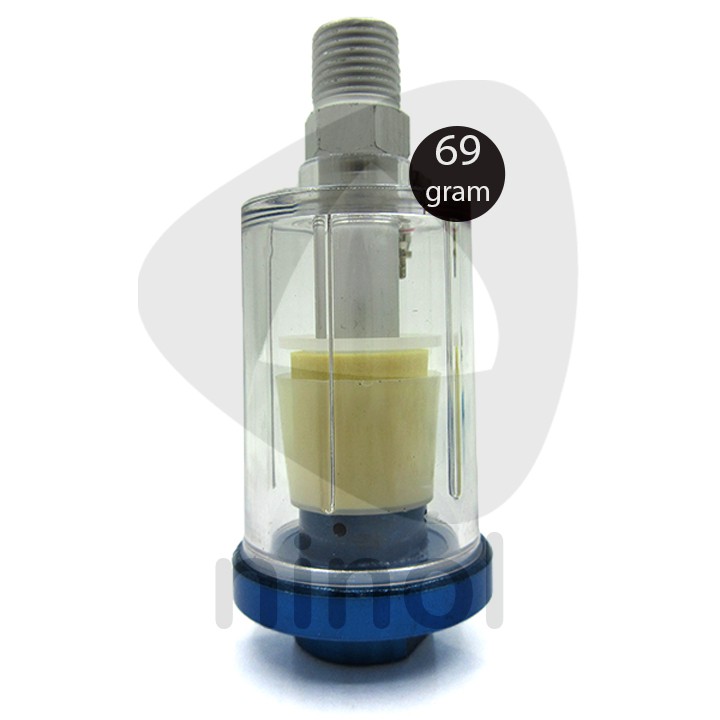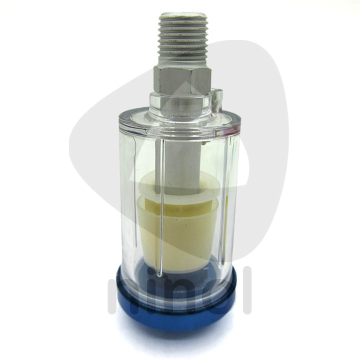 - Lọc nước súng phun sơn khí nén có cấu tạo gồm 1 cốc lọc trong suốt ở bên, dùng để chứa khí nén và ruột lọc để thực hiện quá trình lọc. Chất liệu cốc lọc trong suốt giúp quan sát được tình trạng chất bẩn trong cốc lọc và tháo ra làm sạch kịp thời.