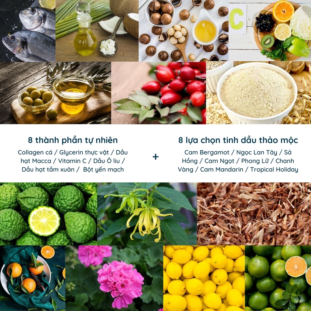 Bột yến mạch, dầu tầm xuân, dầu ô liu, glycerin thực vật, vitamin C, dầu hạt macca, collagen cá, xanthan gum (E415-lên men từ đường bắp với vi khuẩn), dầu barberry,...